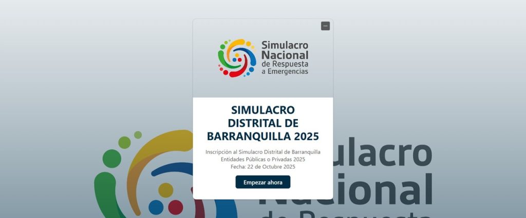 La Alcaldía de Barranquilla, a través de la Oficina de Gestión del Riesgo, invita a toda la ciudadanía a inscribirse y participar en el Simulacro Nacional de Respuesta a Emergencias 2025, que se realizará el miércoles 22 de octubre a las 9:00 a.m.