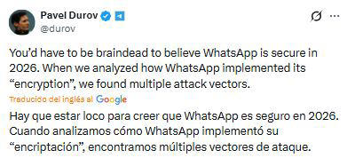 “Hay que estar loco para creer que WhatsApp es seguro en 2026. Cuando analizamos cómo WhatsApp implementó su “encriptación”, encontramos múltiples vectores de ataque”, señaló Pável Dúrov en X.