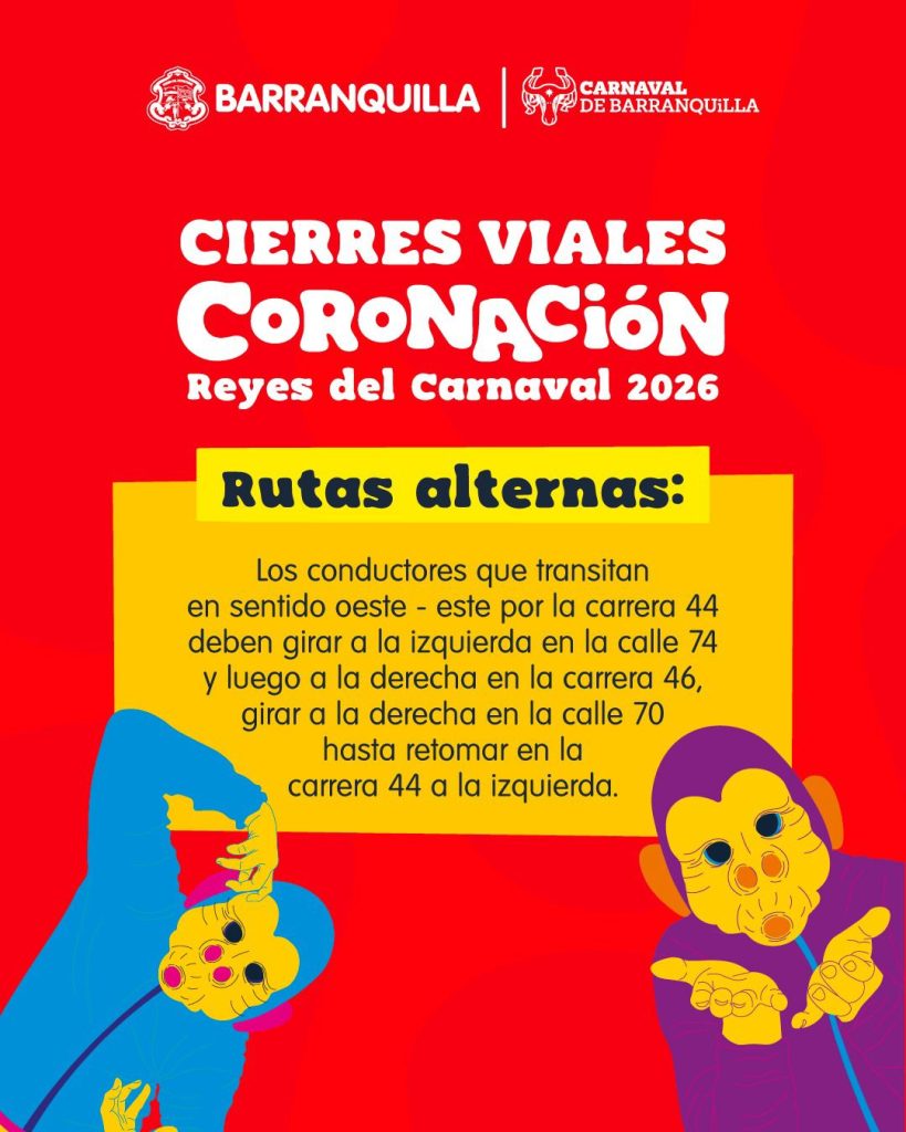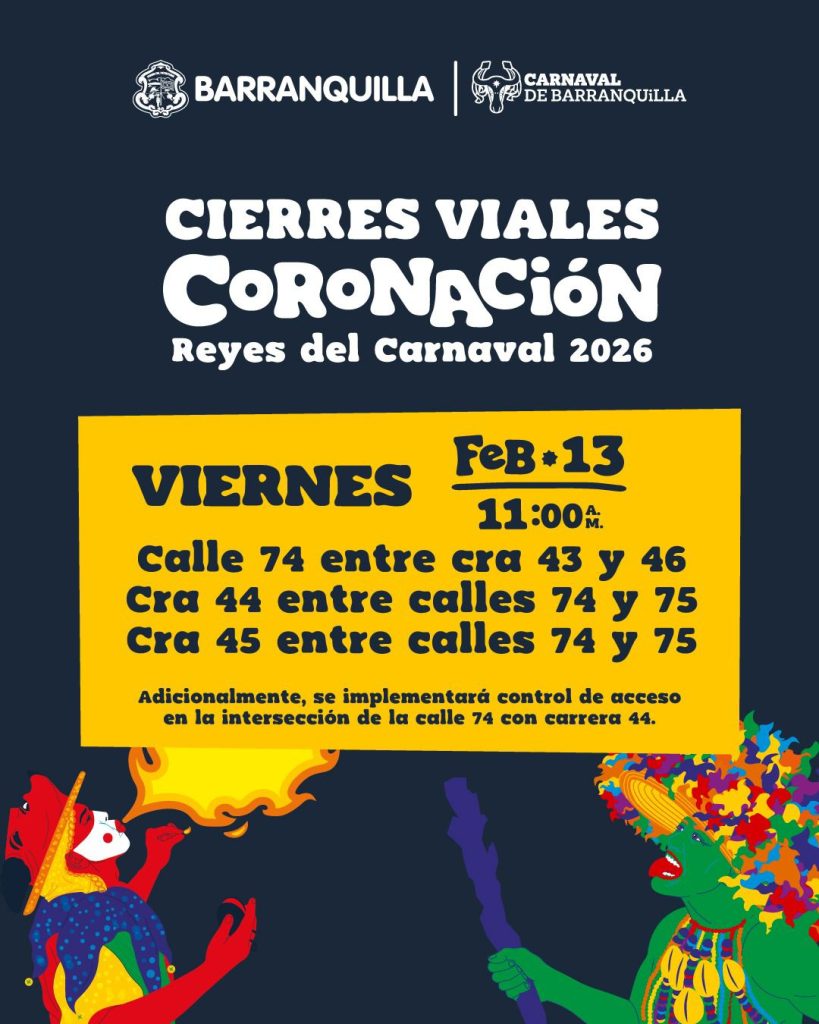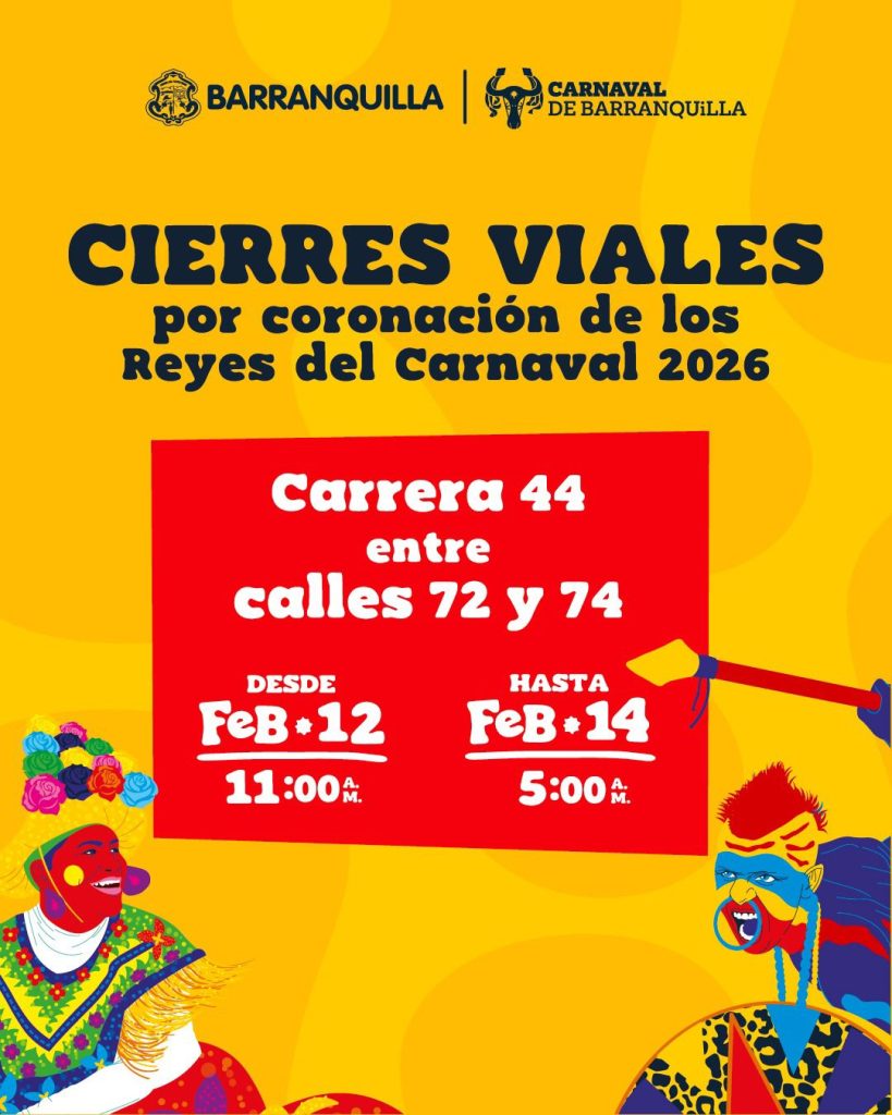 Por el desarrollo de los desfiles del Carnaval, la Secretaría de Tránsito y Seguridad Vial autorizó cierres de vías para el sábado 14, domingo 15 y lunes 16 de febrero en la vía 40 y sus alrededores. Los cierres se realizarán en la vía 40 entre calles 98 y 45 Murillo.