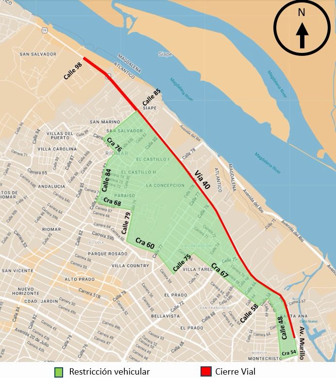 En esta misma zona, lo mismo que en la vía 40 desde la calle 85 hasta la carrera 54, inclusive, también se prohíbe el estacionamiento de vehículos en vía y en todo espacio público, desde las 11:00 p.m. del viernes 13 de febrero hasta las 11:59 p.m. del martes 17 de febrero de 2026.